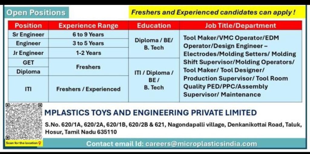 Hiring B Tech/ Diploma/ ITI freshers.