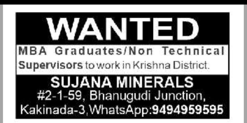 Wanted Staff at Sujana Minarals.