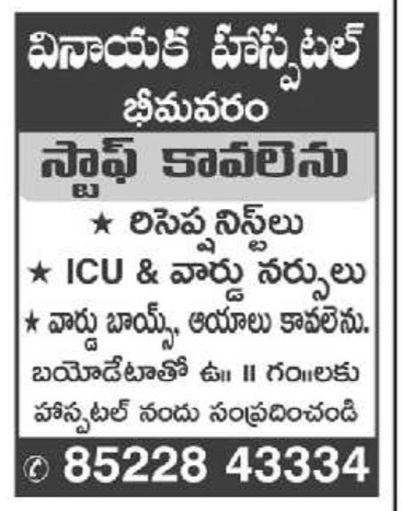 Wanted staff at Vinayaka Hospital.